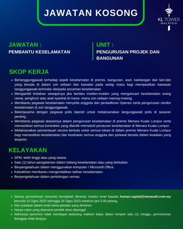Iklan Jawatan Menara Kuala Lumpur Like serta Ikut Facebook Kami, follow Chanel WhatsApp Jawatan Kosong & Telegram Portal SPA9 untuk capaian pantas kekosongan jawatan daripada kami sekarang.