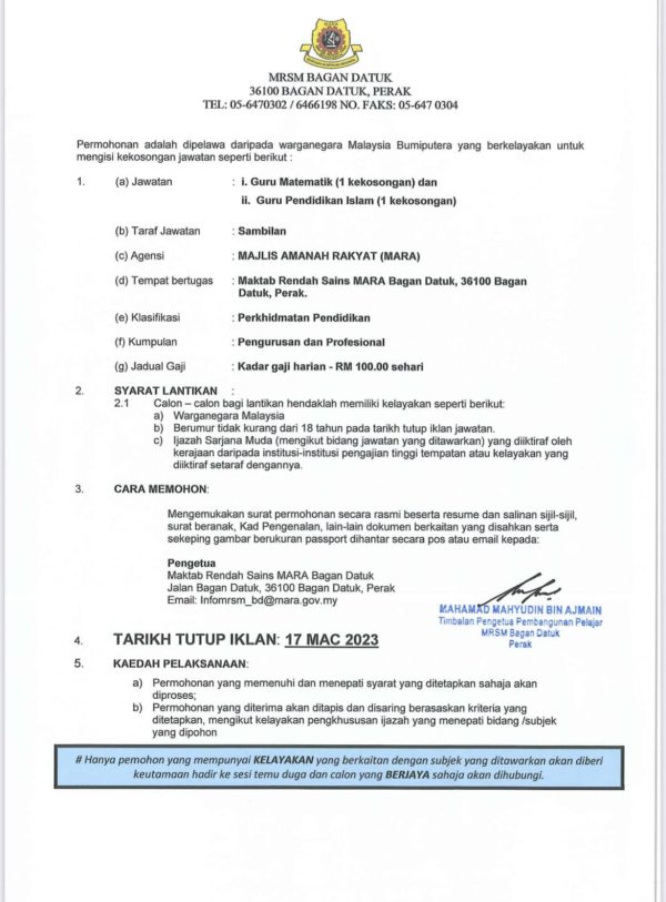 Iklan Jawatan MRSM Bagan Datuk