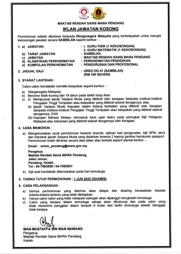 Iklan Jawatan MRSM Pendang Like serta Ikut Facebook Kami, follow Chanel WhatsApp Jawatan Kosong & Telegram Portal SPA9 untuk capaian pantas kekosongan jawatan daripada kami sekarang.