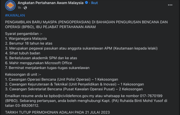 Iklan Jawatan Myaspa (Pengoperasian) Di Bahagian Pengurusan Bencana Dan Operasi (Bpbo) Like serta Ikut Facebook Kami, follow Chanel WhatsApp Jawatan Kosong & Telegram Portal SPA9 untuk capaian pantas kekosongan jawatan daripada kami sekarang.
