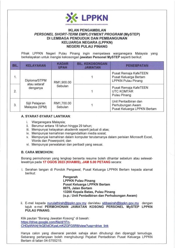IKlan Jawatan Mystep Lembaga Penduduk & Pembangunan Keluarga Negara (LPPKN) Like serta Ikut Facebook Kami, follow Chanel WhatsApp Jawatan Kosong & Telegram Portal SPA9 untuk capaian pantas kekosongan jawatan daripada kami sekarang. Klik Jawatan Disini