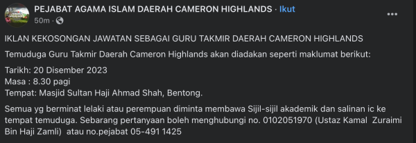 Iklan Jawatan Pejabat Agama Islam Daerah Cameron Highlands Like serta Ikut Facebook Kami, follow Chanel WhatsApp Jawatan Kosong & Telegram Portal SPA9 untuk capaian pantas kekosongan jawatan daripada kami sekarang.
