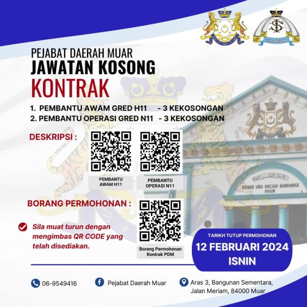 Iklan Jawatan Pejabat Daerah Muar Like serta Ikut Facebook Kami, follow Chanel WhatsApp Jawatan Kosong & Telegram Portal SPA9 untuk capaian pantas kekosongan jawatan daripada kami sekarang.
