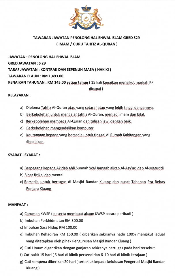 Iklan Jawatan Pejabat Kadi Daerah Kluang Like serta Ikut Facebook Kami, follow Chanel WhatsApp Jawatan Kosong & Telegram Portal SPA9 untuk capaian pantas kekosongan jawatan daripada kami sekarang.