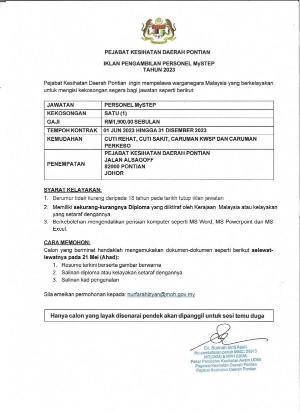 Iklan Jawatan Pejabat Kesihatan Daerah Pontian Like serta Ikut Facebook Kami, follow Chanel WhatsApp Jawatan Kosong & Telegram Portal SPA9 untuk capaian pantas kekosongan jawatan daripada kami sekarang.