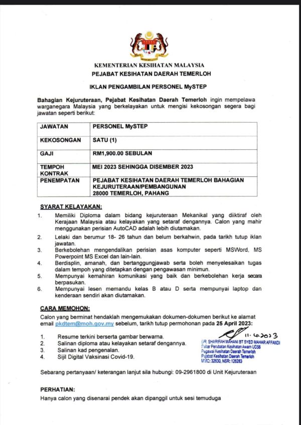 Iklan Jawatan Pejabat Kesihatan Daerah Temerloh Like serta Ikut Facebook Kami, follow Chanel WhatsApp Jawatan Kosong & Telegram Portal SPA9 untuk capaian pantas kekosongan jawatan daripada kami sekarang.
