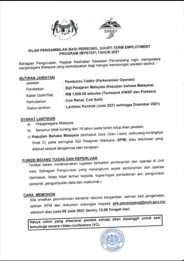Iklan Jawatan Pejabat Kesihatan Kawasan Penampang Like serta Ikut Facebook Kami, follow Chanel WhatsApp Jawatan Kosong & Telegram Portal SPA9 untuk capaian pantas kekosongan jawatan daripada kami sekarang.