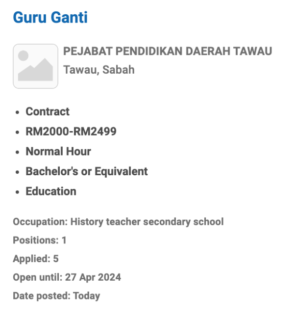Permohonan jawatan ini boleh dibuat melalui Portal MyFutureJobs. Sila ke Portal MyFutureJobs dan Masukkan Kata Carian yang ingin dicari “PEJABAT PENDIDIKAN DAERAH TAWAU” di bahagian carian untuk memohon jawatan yang diiklankan.