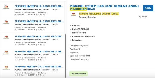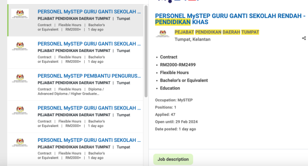 Permohonan jawatan ini boleh dibuat melalui Portal MyFutureJobs. Sila ke Portal MyFutureJobs dan Masukkan Kata Carian yang ingin dicari “PEJABAT PENDIDIKAN DAERAH TUMPAT ” di bahagian carian untuk memohon jawatan yang diiklankan.
