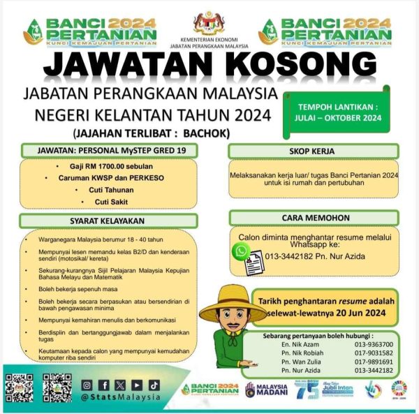 Jangan lepaskan peluang ini untuk membangun kerjaya anda di Jabatan Perangkaan Malaysia Negeri Kelantan. Kami menanti kehadiran anda untuk menjadi sebahagian daripada pasukan kami. Semoga berjaya!