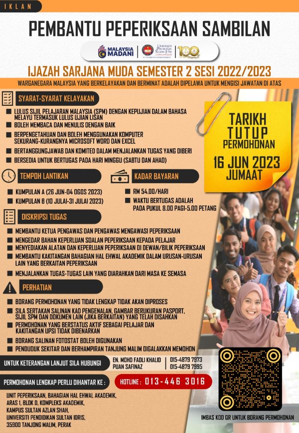 Iklan Jawatan Pembantu Peperiksaan Sambilan (PPS) Like serta Ikut Facebook Kami, follow Chanel WhatsApp Jawatan Kosong & Telegram Portal SPA9 untuk capaian pantas kekosongan jawatan daripada kami sekarang.