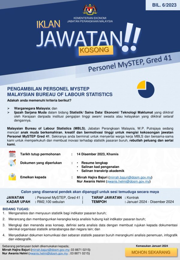 Iklan Jawatan Pengambilan Personel Mystep Malaysian Bureau Of Labour Statistics Like serta Ikut Facebook Kami, follow Chanel WhatsApp Jawatan Kosong & Telegram Portal SPA9 untuk capaian pantas kekosongan jawatan daripada kami sekarang.