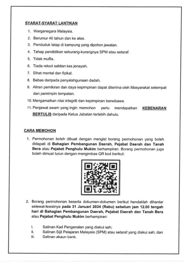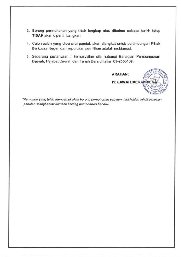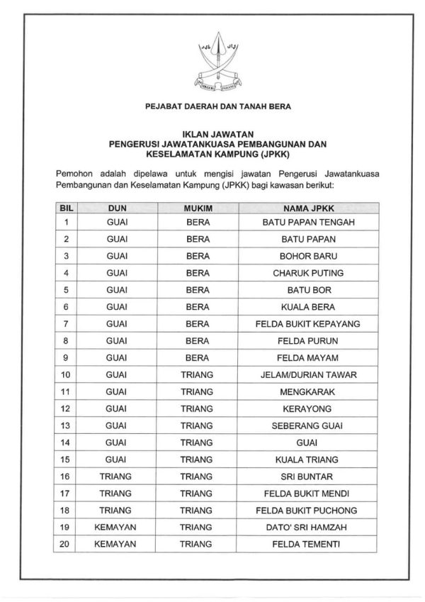 Iklan Jawatan Pengerusi Jawatankuasa Pembangunan Dan Keselamatan Kampung (JPKK) bagi Pejabat Daerah dan Tanah Bera
