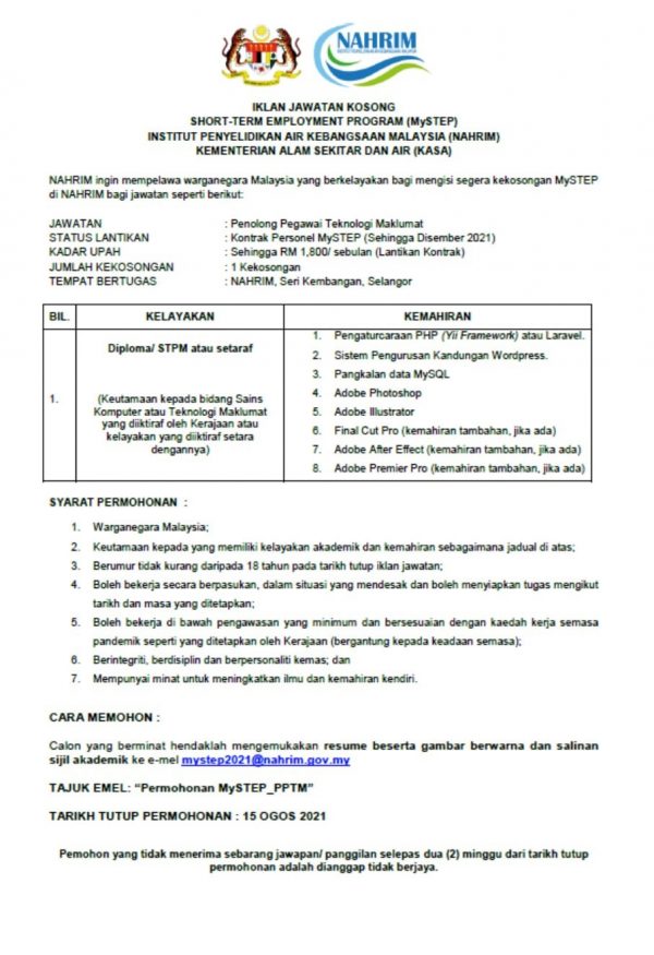 Iklan Jawatan Penyelidikan Air Kebangsaan Malaysia Like serta Ikut Facebook Kami, follow Chanel WhatsApp Jawatan Kosong & Telegram Portal SPA9 untuk capaian pantas kekosongan jawatan daripada kami sekarang.