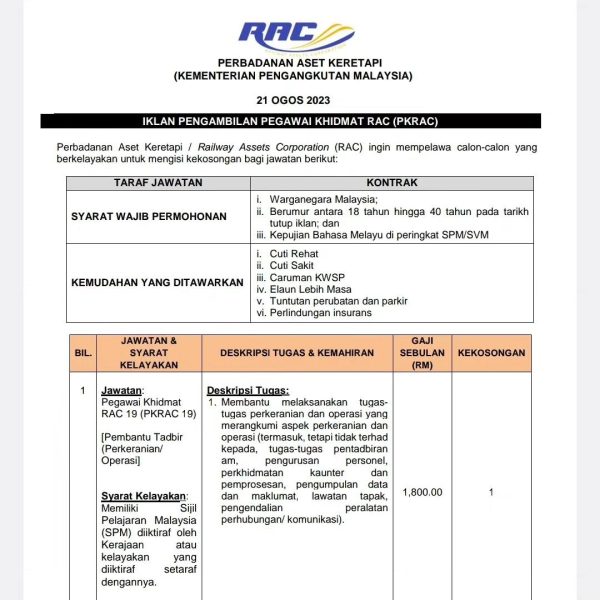 Iklan Jawatan Perbadanan Aset Keretapi (RAC)