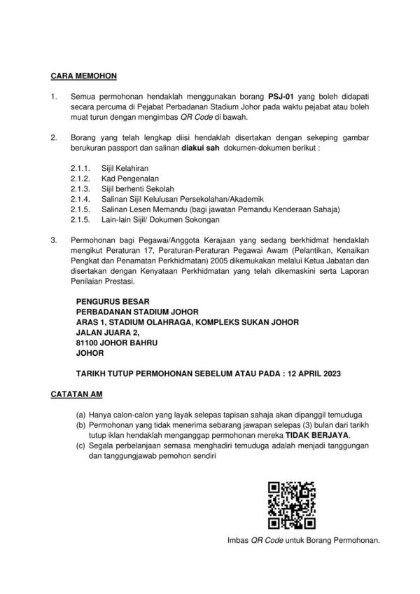 Iklan Jawatan Perbadanan Stadium Johor (MSNJ) Klik Jawatan Disini Like serta Ikut Facebook Kami, follow Chanel WhatsApp Jawatan Kosong & Telegram Portal SPA9 untuk capaian pantas kekosongan jawatan daripada kami sekarang.