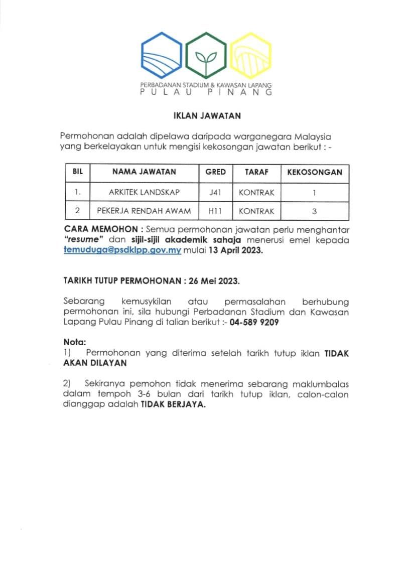 Iklan Jawatan Perbadanan Stadium & Kawasan Lapang Pulau Pinang Like serta Ikut Facebook Kami, follow Chanel WhatsApp Jawatan Kosong & Telegram Portal SPA9 untuk capaian pantas kekosongan jawatan daripada kami sekarang.