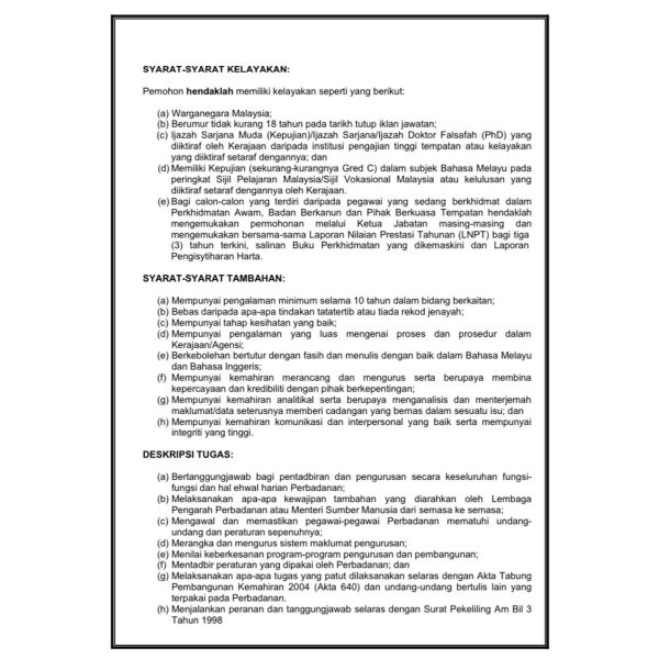 - Jawatan: Ketua Eksekutif Jawatan Terbuka Gred Utama C