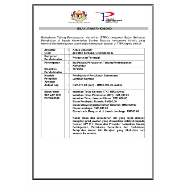 Perbadanan Tabung Pembangunan Kemahiran (PTPK), sebuah agensi di bawah Kementerian Sumber Manusia, kini membuka peluang pekerjaan untuk jawatan Ketua Eksekutif Jawatan Terbuka Gred Utama C. Ini adalah peluang yang hebat untuk Warganegara Malaysia yang berkelayakan dan Pegawai Perkhidmatan Awam yang sedang berkhidmat dengan Kerajaan Malaysia.