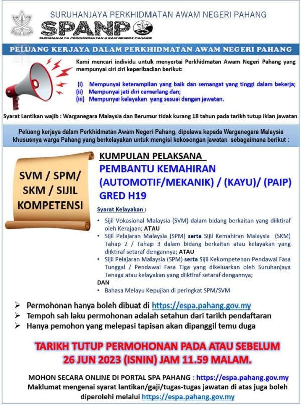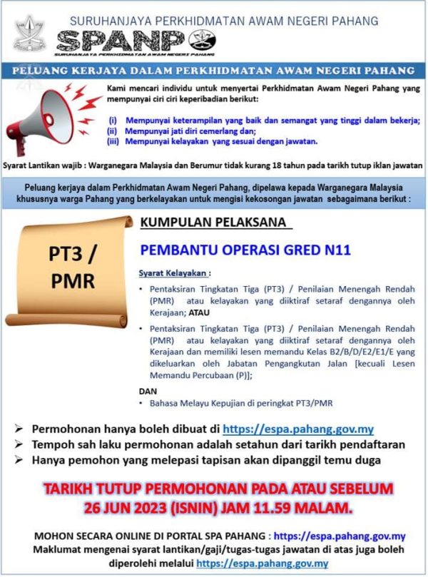 Iklan Jawatan Perkhidmatan Awam Negeri Pahang Like serta Ikut Facebook Kami, follow Chanel WhatsApp Jawatan Kosong & Telegram Portal SPA9 untuk capaian pantas kekosongan jawatan daripada kami sekarang.
