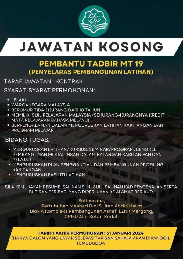 Iklan Jawatan Pertubuhan Maahad Dini Sultan Abdul Halim Klik Jawatan Disini Like serta Ikut Facebook Kami, follow Chanel WhatsApp Jawatan Kosong & Telegram Portal SPA9 untuk capaian pantas kekosongan jawatan daripada kami sekarang.