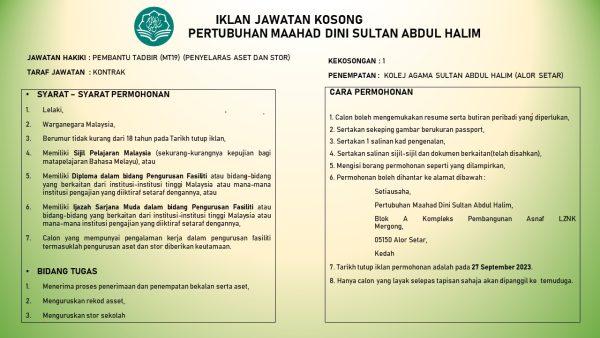 Iklan Jawatan Pertubuhan Maahad Dini Sultan Abdul Halim (Sekolah Zakat Kedah) Like serta Ikut Facebook Kami, follow Chanel WhatsApp Jawatan Kosong & Telegram Portal SPA9 untuk capaian pantas kekosongan jawatan daripada kami sekarang.