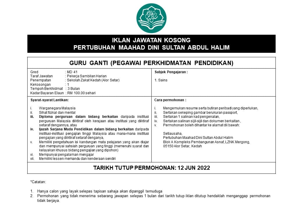 Iklan Jawatan Pertubuhan Maahad Dini Sultan Abdul Halim (Sekolah Zakat Kedah) Like serta Ikut Facebook Kami, follow Chanel WhatsApp Jawatan Kosong & Telegram Portal SPA9 untuk capaian pantas kekosongan jawatan daripada kami sekarang.