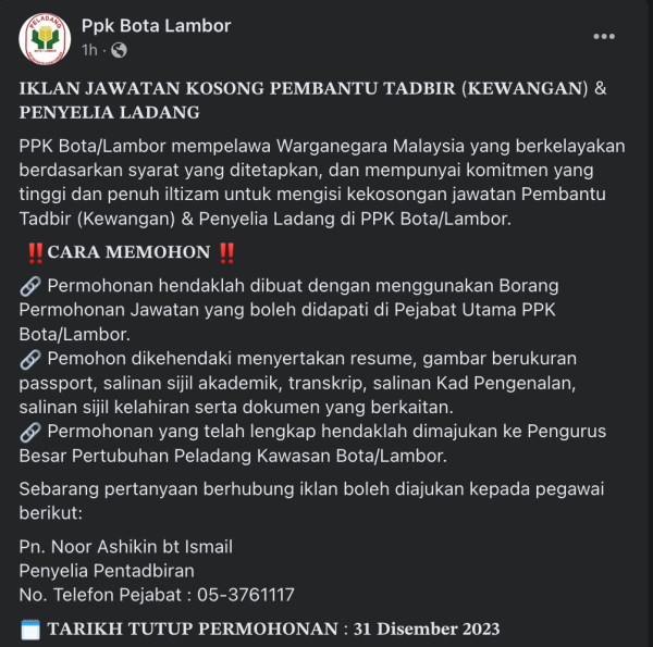 Iklan Jawatan Pertubuhan Peladang Kawasan Kawasan Bota/Lambor Like serta Ikut Facebook Kami, follow Chanel WhatsApp Jawatan Kosong & Telegram Portal SPA9 untuk capaian pantas kekosongan jawatan daripada kami sekarang.