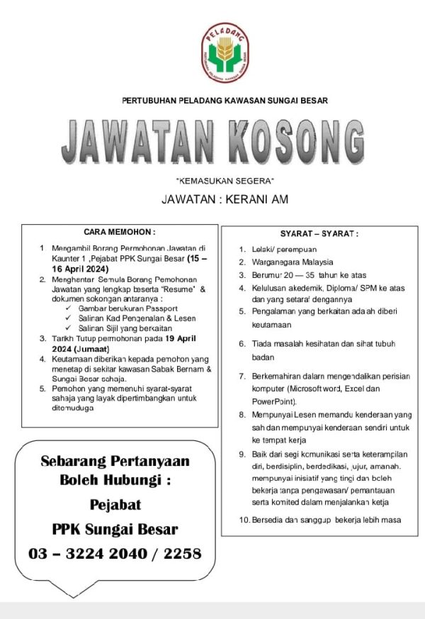 Iklan Jawatan Pertubuhan Peladang Kawasan Sungai Besar Like serta Ikut Facebook Kami, follow Chanel WhatsApp Jawatan Kosong & Telegram Portal SPA9 untuk capaian pantas kekosongan jawatan daripada kami sekarang.