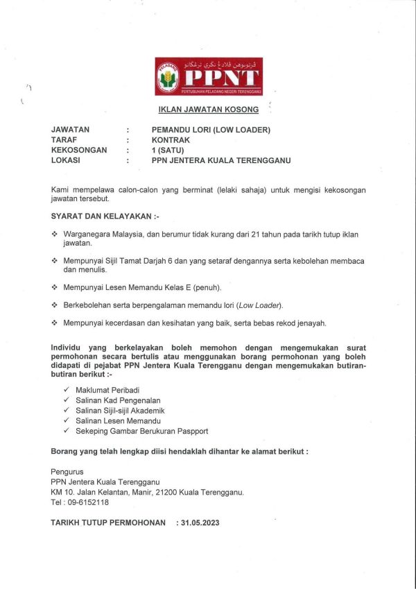 Iklan Jawatan Pertubuhan Peladang Negeri Terengganu