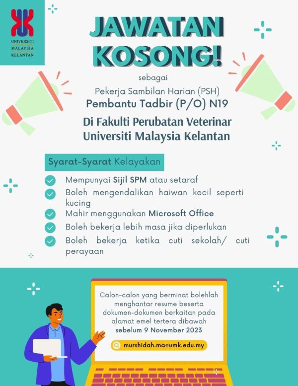 Iklan Jawatan Pihak Fakulti Perubatan Veterinar Universiti Malaysia Kelantan Like serta Ikut Facebook Kami, follow Chanel WhatsApp Jawatan Kosong & Telegram Portal SPA9 untuk capaian pantas kekosongan jawatan daripada kami sekarang.