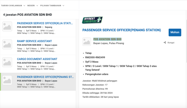 Permohonan jawatan ini boleh dibuat melalui Portal MyFutureJobs. Sila ke Portal MyFutureJobs dan Masukkan Kata Carian yang ingin dicari “POS AVIATION SDN BHD” di bahagian carian untuk memohon jawatan yang diiklankan.