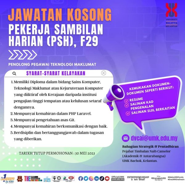 Iklan Jawatan PSH Universiti Malaysia Kelantan (UMK) Like serta Ikut Facebook Kami, follow Chanel WhatsApp Jawatan Kosong & Telegram Portal SPA9 untuk capaian pantas kekosongan jawatan daripada kami sekarang.