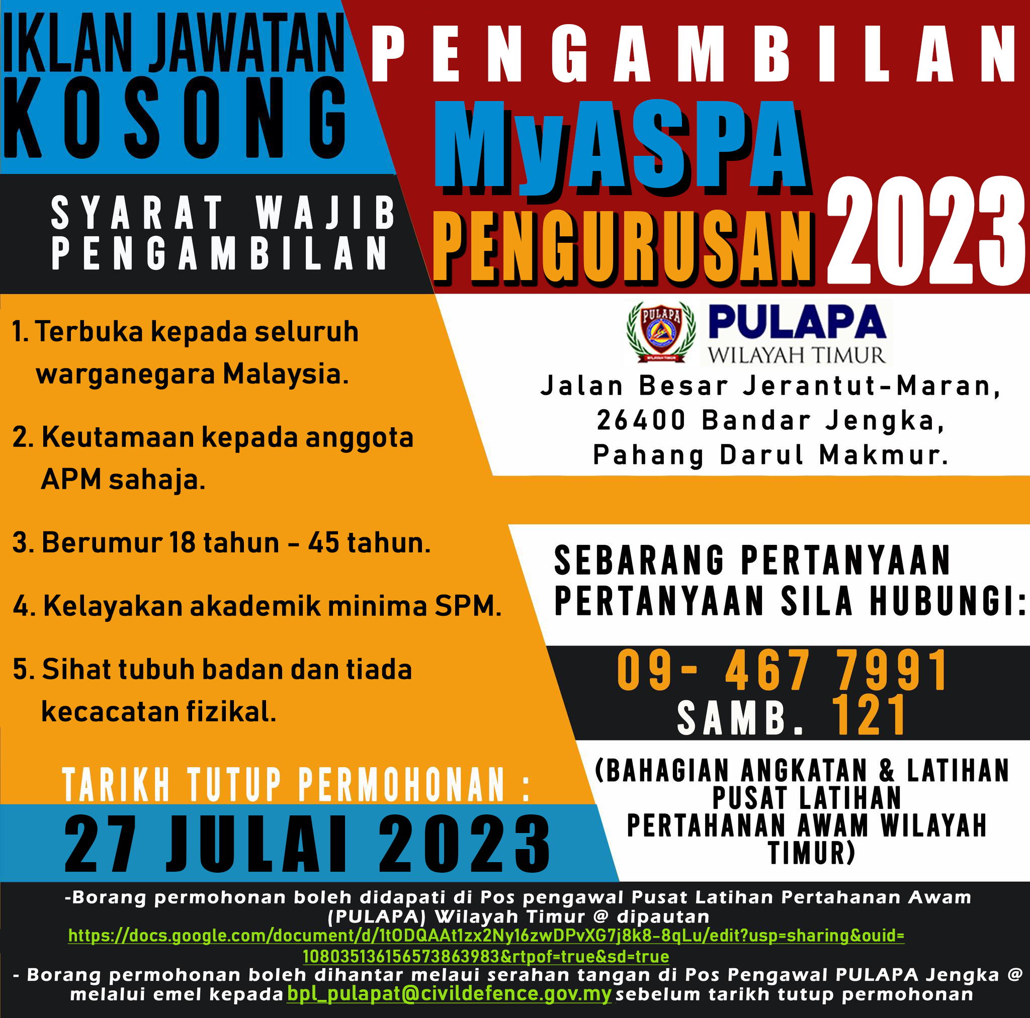 Iklan Jawatan Pusat Latihan Pertahanan Awam (PULAPA) Like serta Ikut Facebook Kami, follow Chanel WhatsApp Jawatan Kosong & Telegram Portal SPA9 untuk capaian pantas kekosongan jawatan daripada kami sekarang. Klik Jawatan Disini