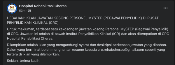 Iklan Jawatan Pusat Penyelidikan Klinikal (CRC) Like serta Ikut Facebook Kami, follow Chanel WhatsApp Jawatan Kosong & Telegram Portal SPA9 untuk capaian pantas kekosongan jawatan daripada kami sekarang.