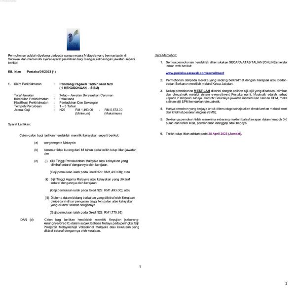 Iklan Jawatan Pustaka Negeri Sarawak Like serta Ikut Facebook Kami, follow Chanel WhatsApp Jawatan Kosong & Telegram Portal SPA9 untuk capaian pantas kekosongan jawatan daripada kami sekarang.