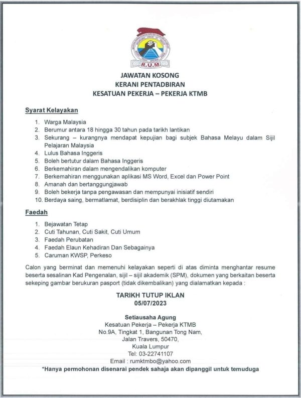 Iklan Jawatan Railwaymens Union of Malaya – RUM Like serta Ikut Facebook Kami, follow Chanel WhatsApp Jawatan Kosong & Telegram Portal SPA9 untuk capaian pantas kekosongan jawatan daripada kami sekarang.