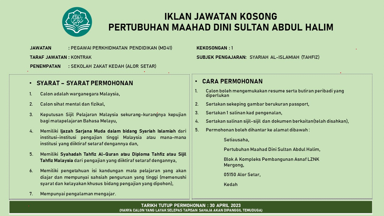 Iklan Jawatan Sekolah Zakat Kedah (Alor Setar) Like serta Ikut Facebook Kami, follow Chanel WhatsApp Jawatan Kosong & Telegram Portal SPA9 untuk capaian pantas kekosongan jawatan daripada kami sekarang.