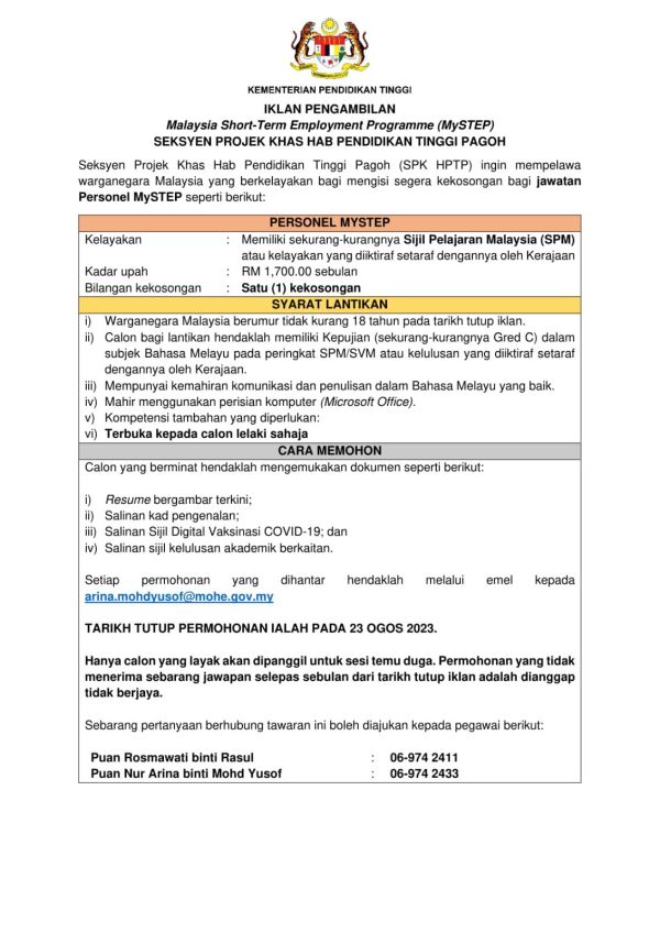 Iklan Jawatan Seksyen Projek Khas Hab Pendidikan Tinggi Pagoh (SPK HPTP) (KPT) Like serta Ikut Facebook Kami, follow Chanel WhatsApp Jawatan Kosong & Telegram Portal SPA9 untuk capaian pantas kekosongan jawatan daripada kami sekarang.