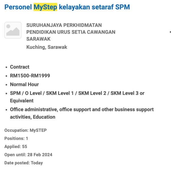 Permohonan jawatan ini boleh dibuat melalui Portal MyFutureJobs. Sila ke Portal MyFutureJobs dan Masukkan Kata Carian yang ingin dicari “SURUHANJAYA PERKHIDMATAN PENDIDIKAN URUS SETIA CAWANGAN SARAWAK” di bahagian carian untuk memohon jawatan yang diiklankan.