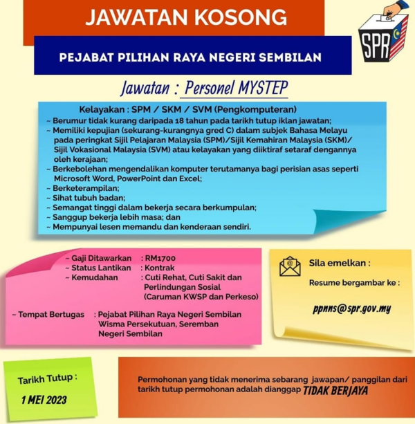 Iklan Jawatan Suruhanjaya Pilihanraya (SPR) Like serta Ikut Facebook Kami, follow Chanel WhatsApp Jawatan Kosong & Telegram Portal SPA9 untuk capaian pantas kekosongan jawatan daripada kami sekarang.