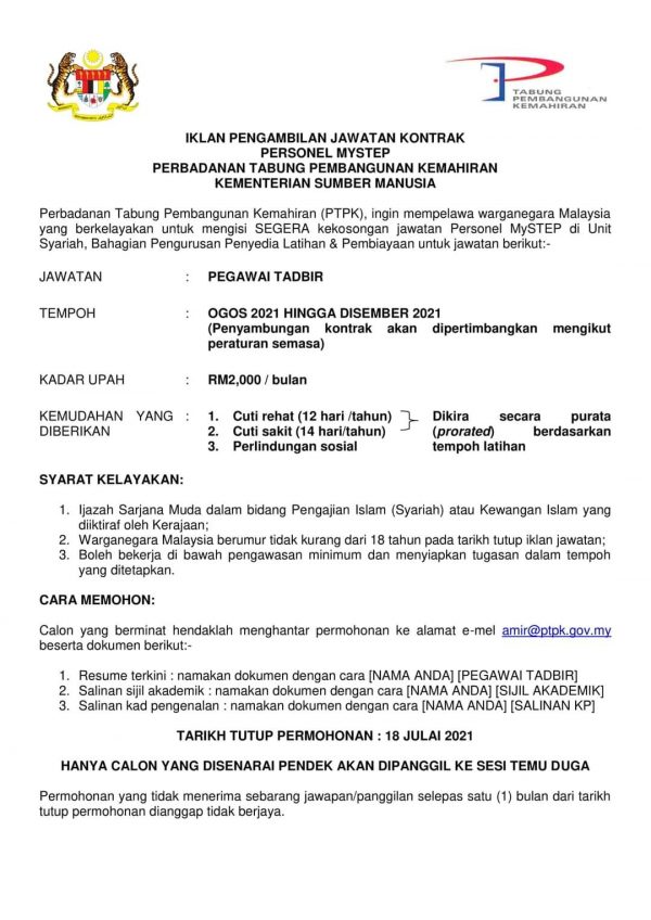 Iklan Jawatan Tabung Pembangunan Kemahiran Like serta Ikut Facebook Kami, follow Chanel WhatsApp Jawatan Kosong & Telegram Portal SPA9 untuk capaian pantas kekosongan jawatan daripada kami sekarang.