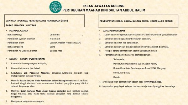 Iklan Jawatan Tekini Pertubuhan Maahad Dini Sultan Abdul Halim (Sekolah Zakat Kedah) Like serta Ikut Facebook Kami, follow Chanel WhatsApp Jawatan Kosong & Telegram Portal SPA9 untuk capaian pantas kekosongan jawatan daripada kami sekarang.