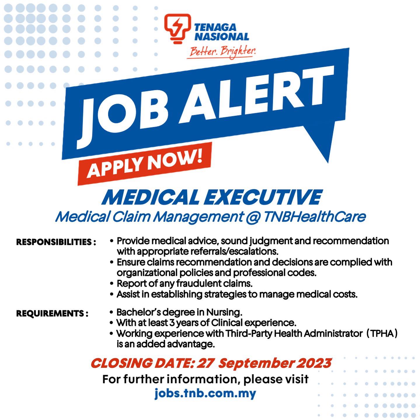 Iklan Jawatan Tenaga Nasional Berhad (TNB) Like serta Ikut Facebook Kami, follow Chanel WhatsApp Jawatan Kosong & Telegram Portal SPA9 untuk capaian pantas kekosongan jawatan daripada kami sekarang.