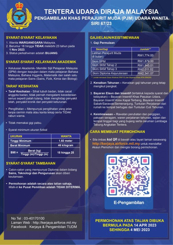 Iklan Jawatan Tentera Udara Diraja Malaysia (TUDM) Like serta Ikut Facebook Kami, follow Chanel WhatsApp Jawatan Kosong & Telegram Portal SPA9 untuk capaian pantas kekosongan jawatan daripada kami sekarang.