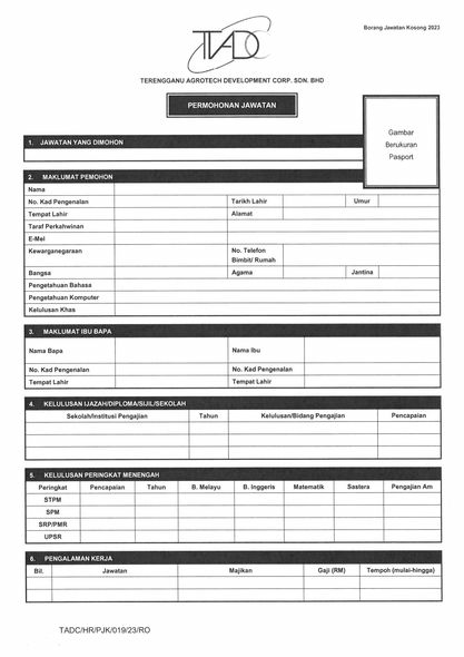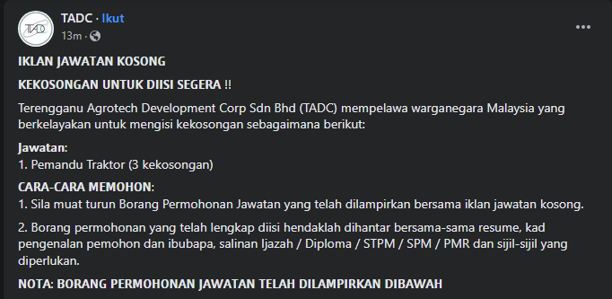Iklan Jawatan Terengganu Agrotech Development Corp Sdn Bhd (TADC) Like serta Ikut Facebook Kami, follow Chanel WhatsApp Jawatan Kosong & Telegram Portal SPA9 untuk capaian pantas kekosongan jawatan daripada kami sekarang.