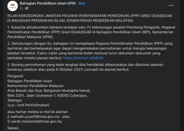 Iklan Jawatan Terkini Kementerian Pendidikan Malaysia (KPM) Klik Jawatan Disini Like serta Ikut Facebook Kami, follow Chanel WhatsApp Jawatan Kosong & Telegram Portal SPA9 untuk capaian pantas kekosongan jawatan daripada kami sekarang.