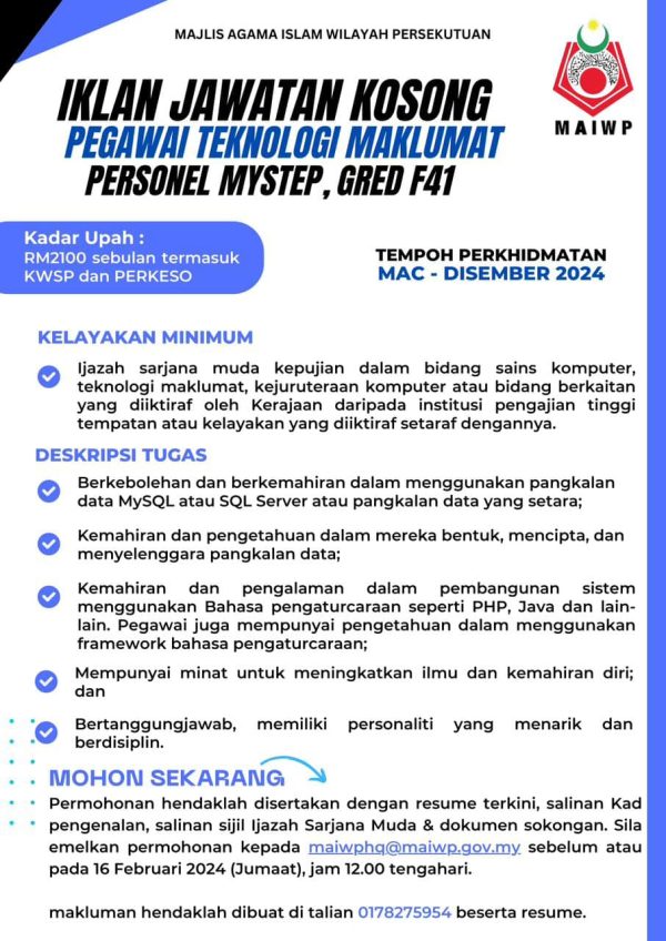 Iklan Jawatan Terkini MAIWP Like serta Ikut Facebook Kami, follow Chanel WhatsApp Jawatan Kosong & Telegram Portal SPA9 untuk capaian pantas kekosongan jawatan daripada kami sekarang.