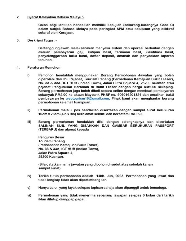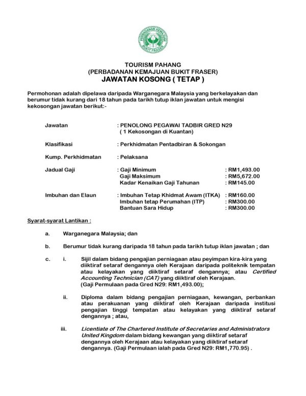 Iklan Jawatan Tourism Pahang Perbadanan Kemajuan Bukit Fraser Like serta Ikut Facebook Kami, follow Chanel WhatsApp Jawatan Kosong & Telegram Portal SPA9 untuk capaian pantas kekosongan jawatan daripada kami sekarang. Klik Jawatan Disini