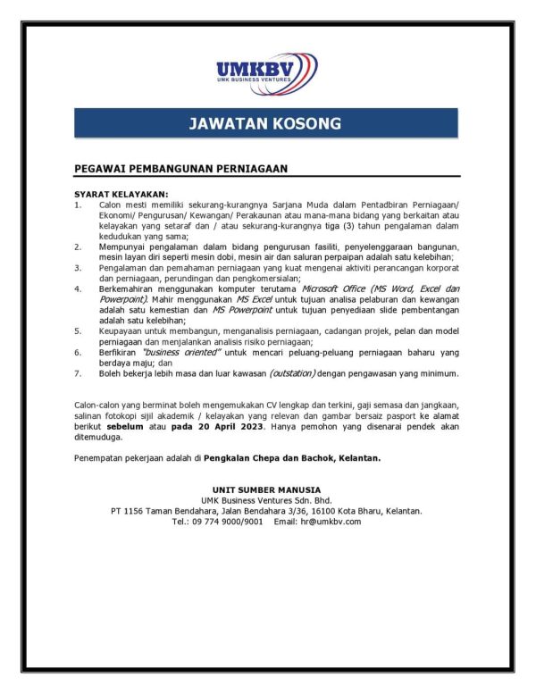 Iklan Jawatan UMK Business Ventures Sdn Bhd